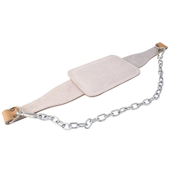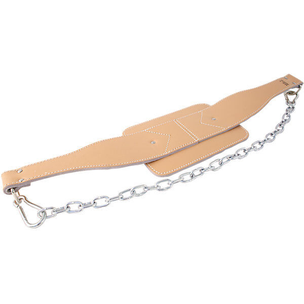 - Pass chain through support ring on the opposite side of the heavy-duty leather dip belt, then pass through weight plate and fasten clasp to support ring to which chain is attached