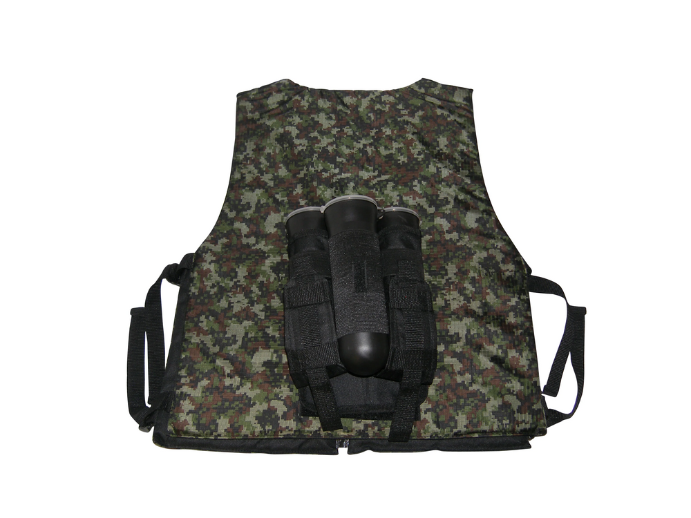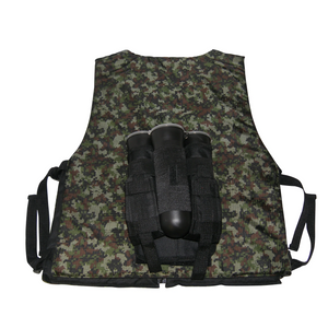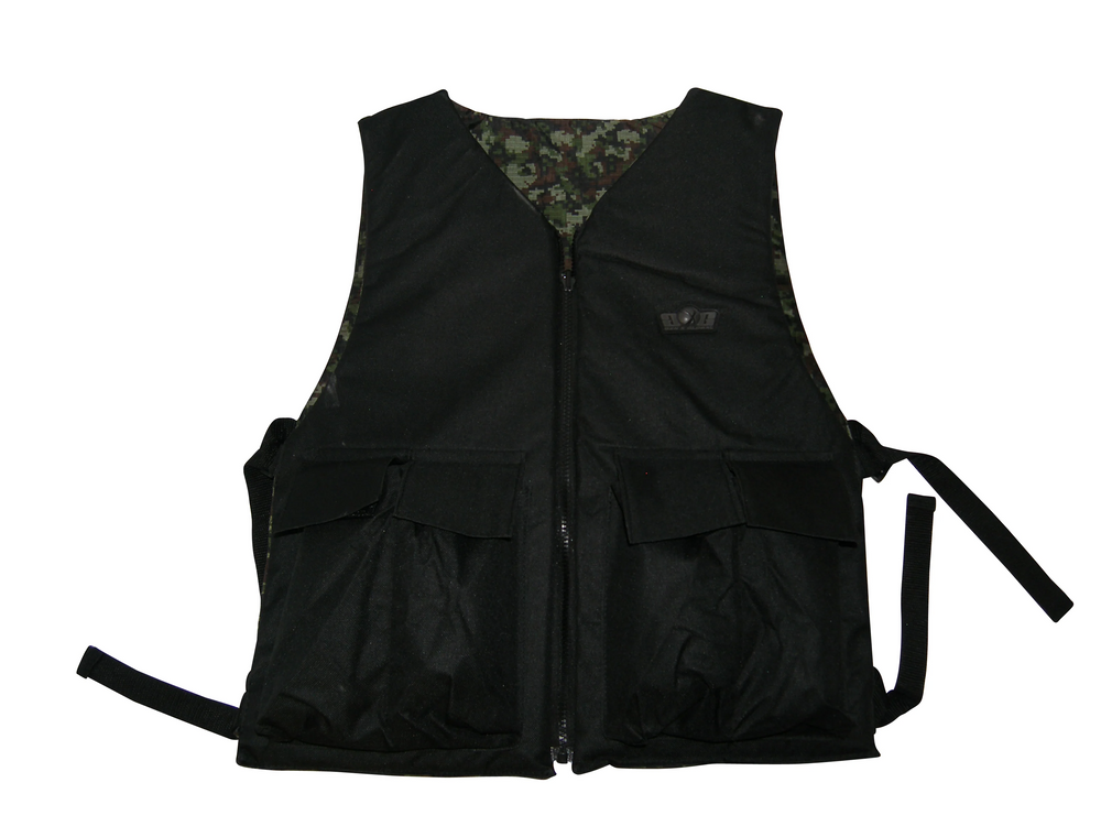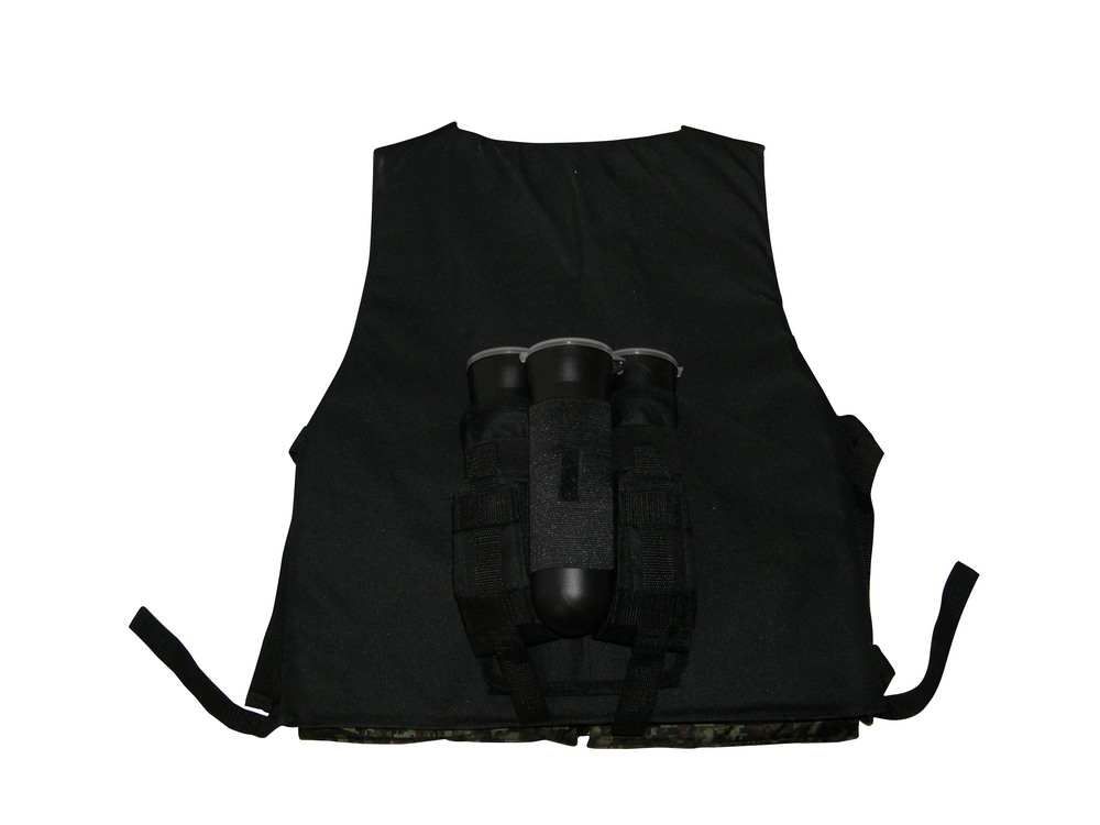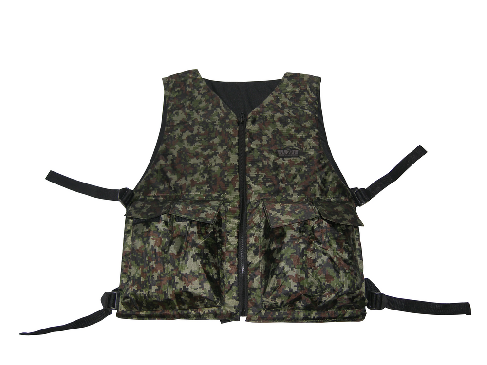 - DIGITAL GREEN CAMO/BLACKVest style multi-purpose carrier. Reversible design. Can be used for Paintball or Airsoft. Includes removable 2+1 pack for pods on the back and large storage pockets on the front (can hold 100 round tubes). One size fits all. 19" wide; 21.5" long. Side extenders are 10" long.