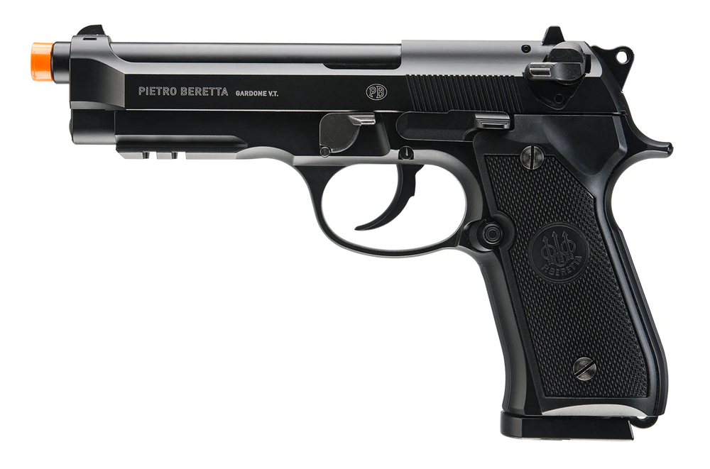 - This is the popular M92 A1 sidearm which is a tactical version of the famous 92FS. Licensed by Beretta; so you know this isn't a cheap plastic knock-off! Features an integrated Picatinny Rail; all Metal frame & magazine; Blowback action; and more! Specifications Brand: Beretta Velocity (FPS): 300 FPS Caliber: 6mm Ammo Type: Airsoft BBs Smoothbore Barrel Length: 4.5 Total Length: 8.5" Front Sight Type: Fixed; Tactical Rear Sight Type: Fixed; Tactical Action: Double Power: CO2