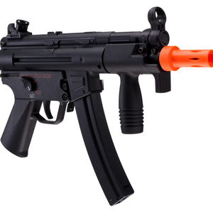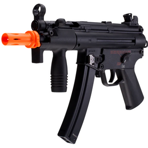 - One of the most famous assault guns in the compact pistol version! The H&K MP5 K AEG features a reinforced nylon fiber body; reinforced metal gears & gearbox; combat front & rear sights and enhanced sector gear for more reliable feeding from the magazine. Fully licensed by Heckler & Koch. Features: Hop-Up: Adjustable Rotary-style 8.4v NiMH Rechargeable Battery & Charger Included Firing Modes: Semi/Full/Safety 200rd Metal Hi-Capacity Magazine Barrel: 6.75" Velocity: 280 fps Length: 15.4". Weight: 3.1 lbs 60 Day Umarex Warranty